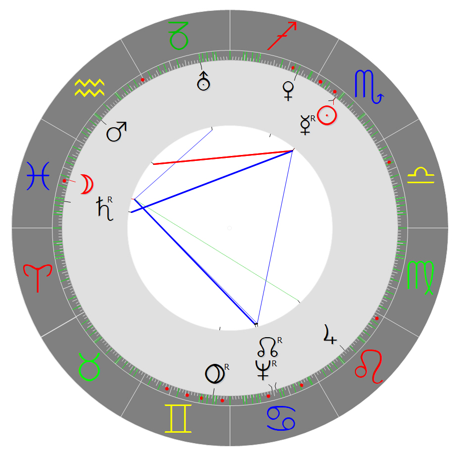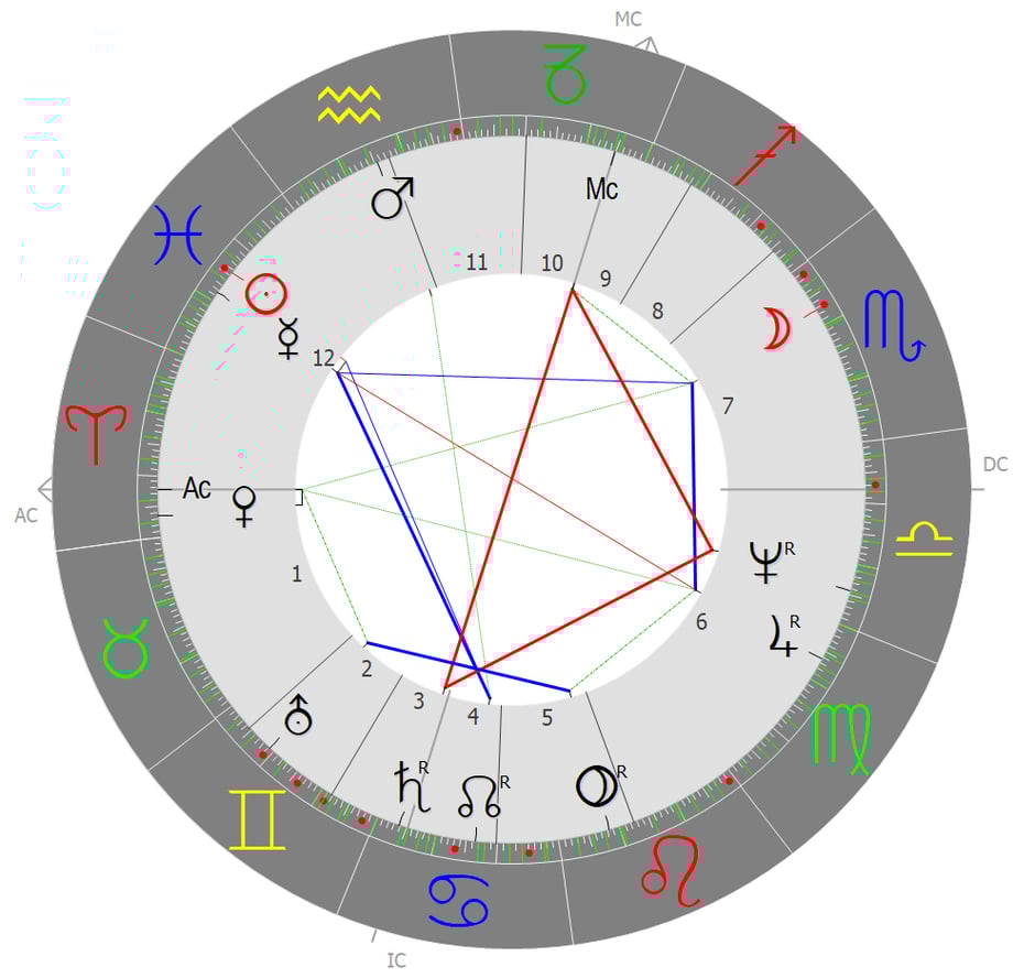 Pluto im Löwen in Haus 5 (und an der Spitze einer Drachenfigur) betont, wie sehr sie selbst Mittelpunkt ihres Lebens (das ein Spiel zu sein scheint) ist. Die eigenen Ideen werden um jeden Preis umgesetzt. Da gibt es eine Neigung zur perfekten Selbstdarstellung und auch über andere zu bestimmen. Ebenso schafft mn sich aber auch bahnbrechende Gestaltungsmöglichkeiten im eigenen Leben.
