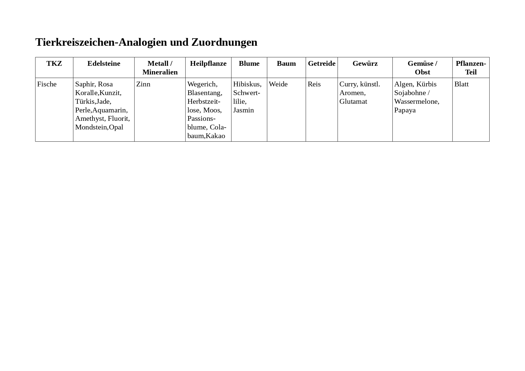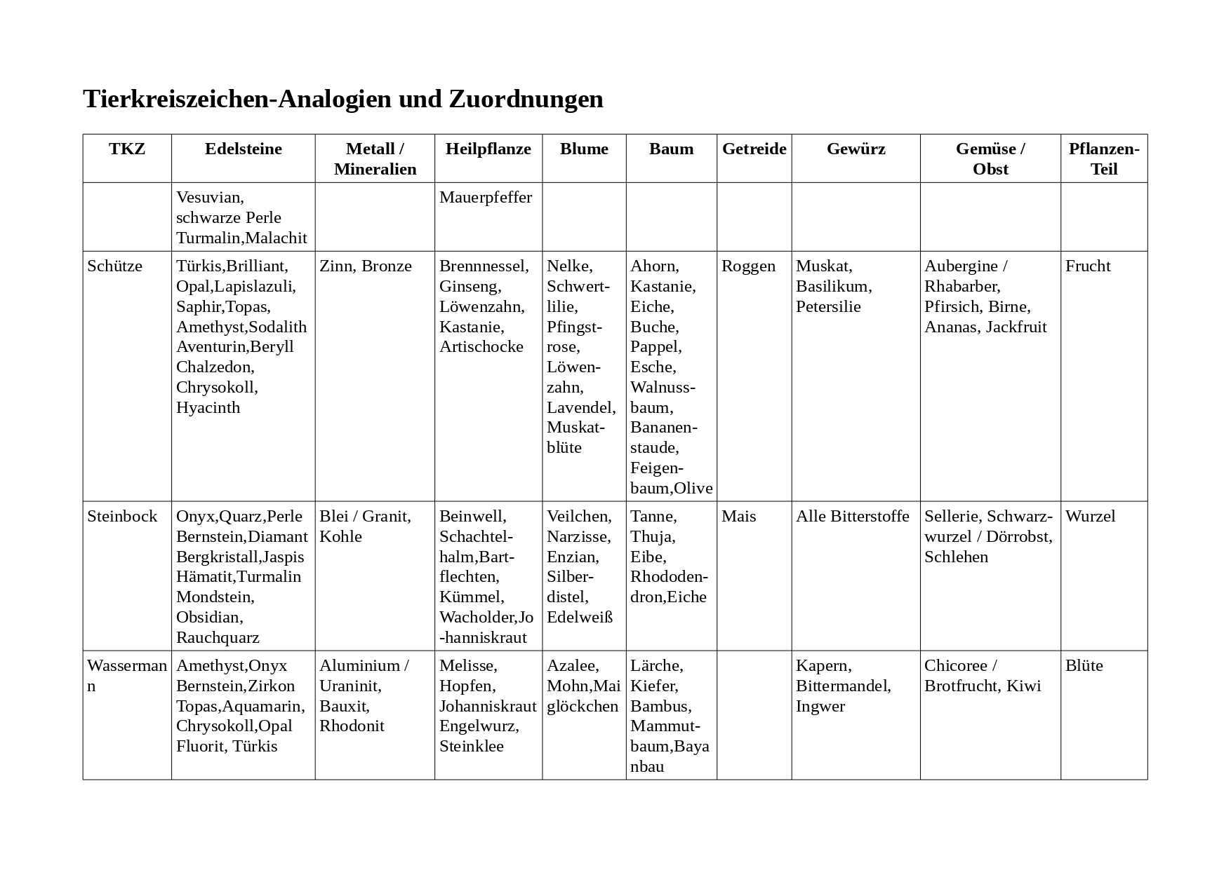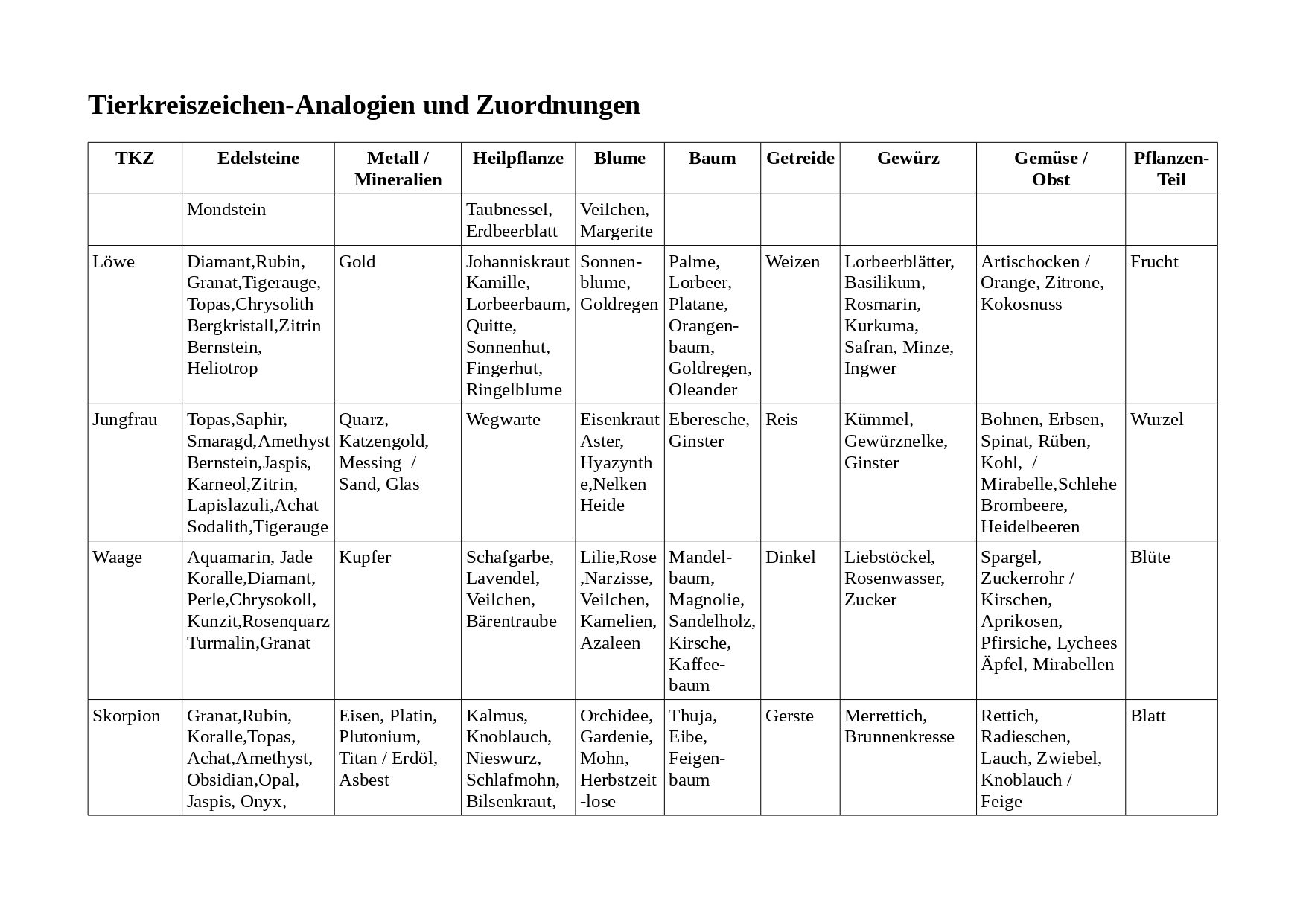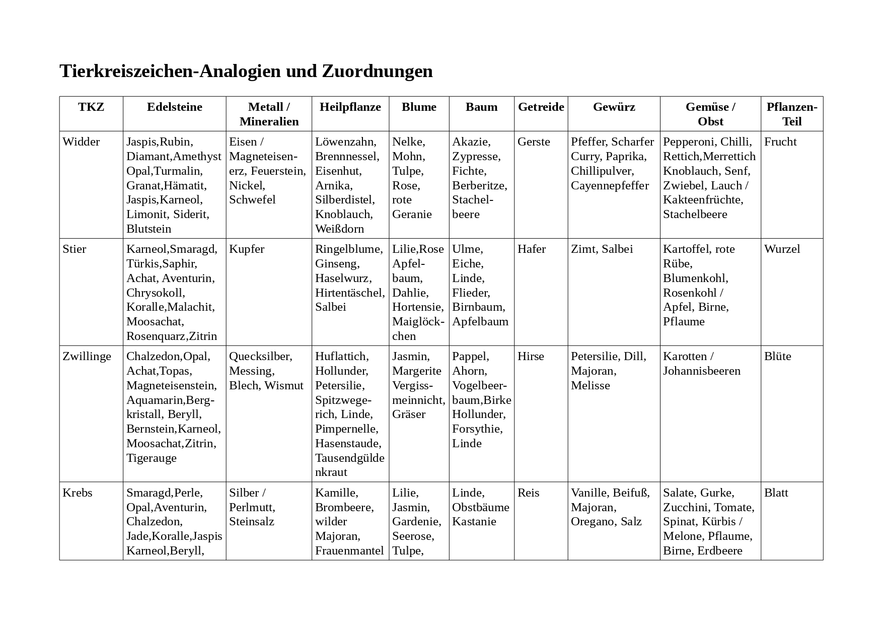 Welcher Edelstein passt zu wem ? Wie sind die Entsprechungen von Mineralien oder Heilpflanzen ? Welche Analogien gibt es zu Blumen, Bäumen oder Getreideformen ? Welche Geschmackseigenschaften oder Pflanzenteile drücken Eigenschaften der Sternzeichen aus ?