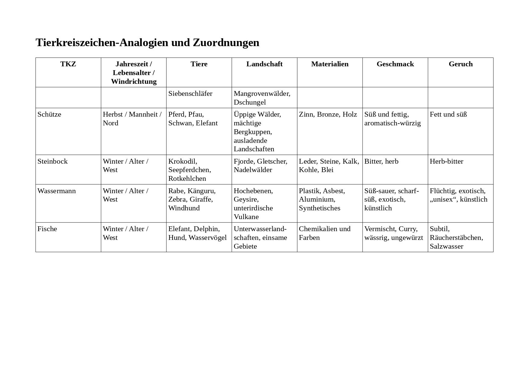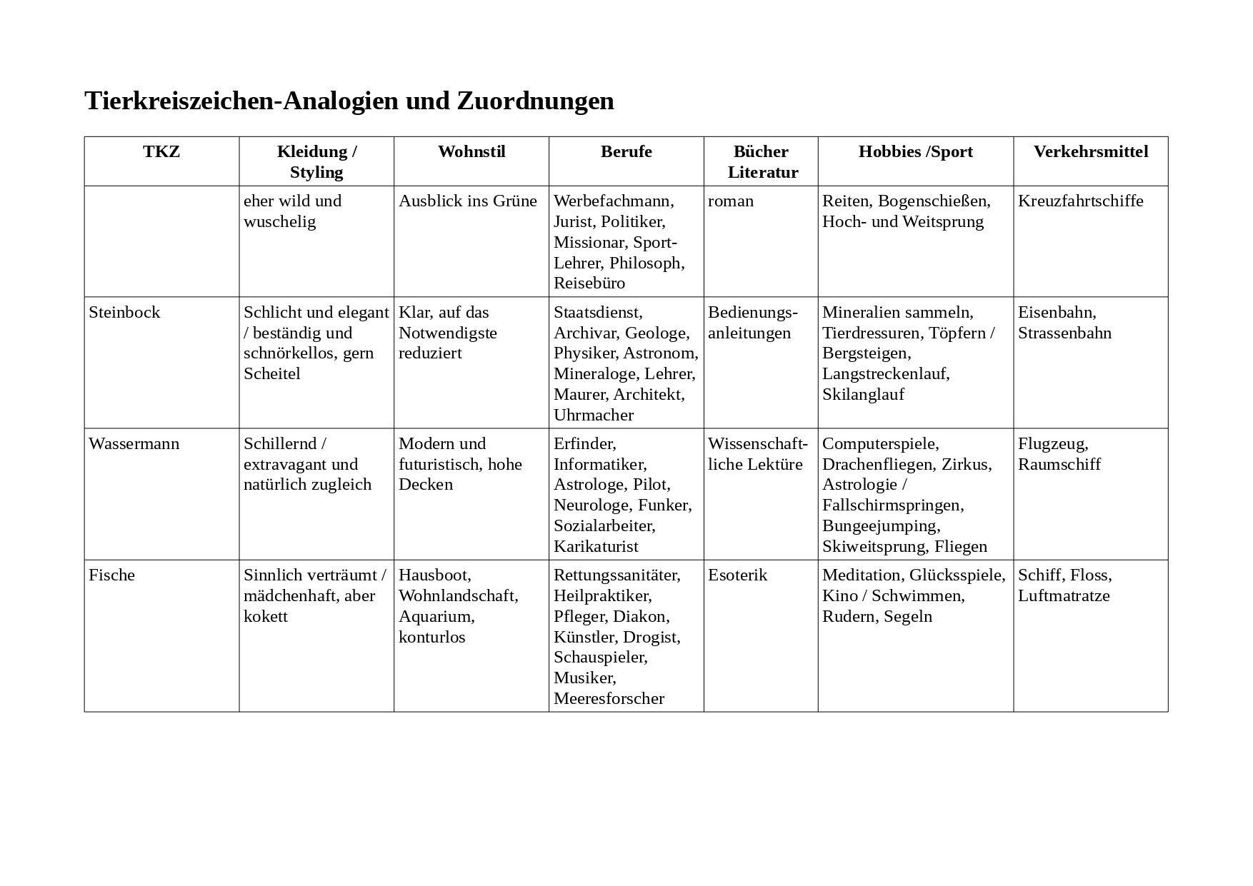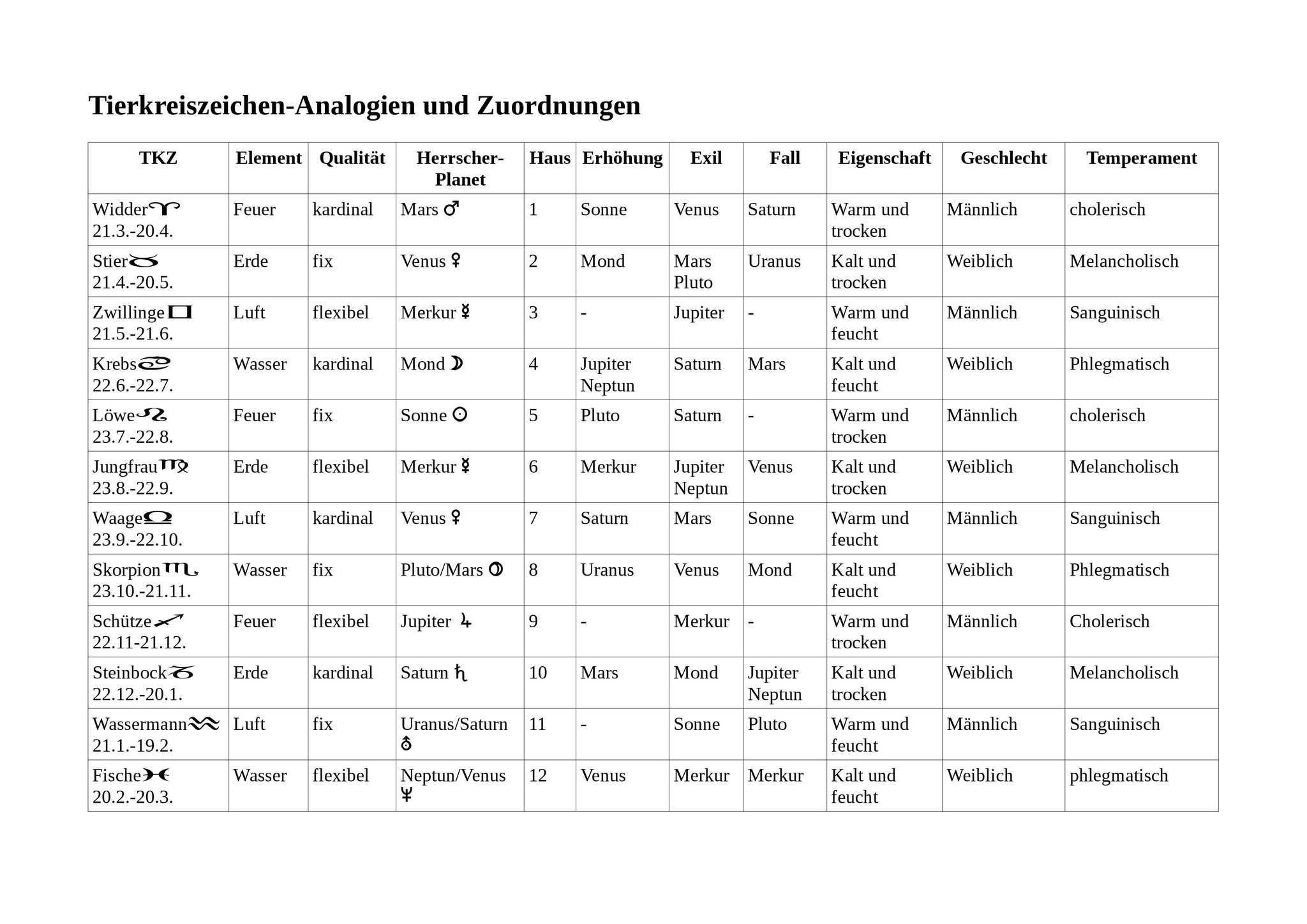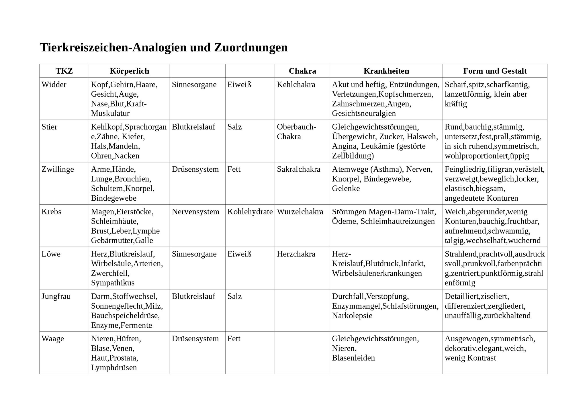 Mit der Unterstützung von astrologischen Büchern und Internet-Funden habe ich eine große Sammlung von Analogien, Anlehnungen oder Zuordnungen zu den 12 Tierkreiszeichen aufbereitet.