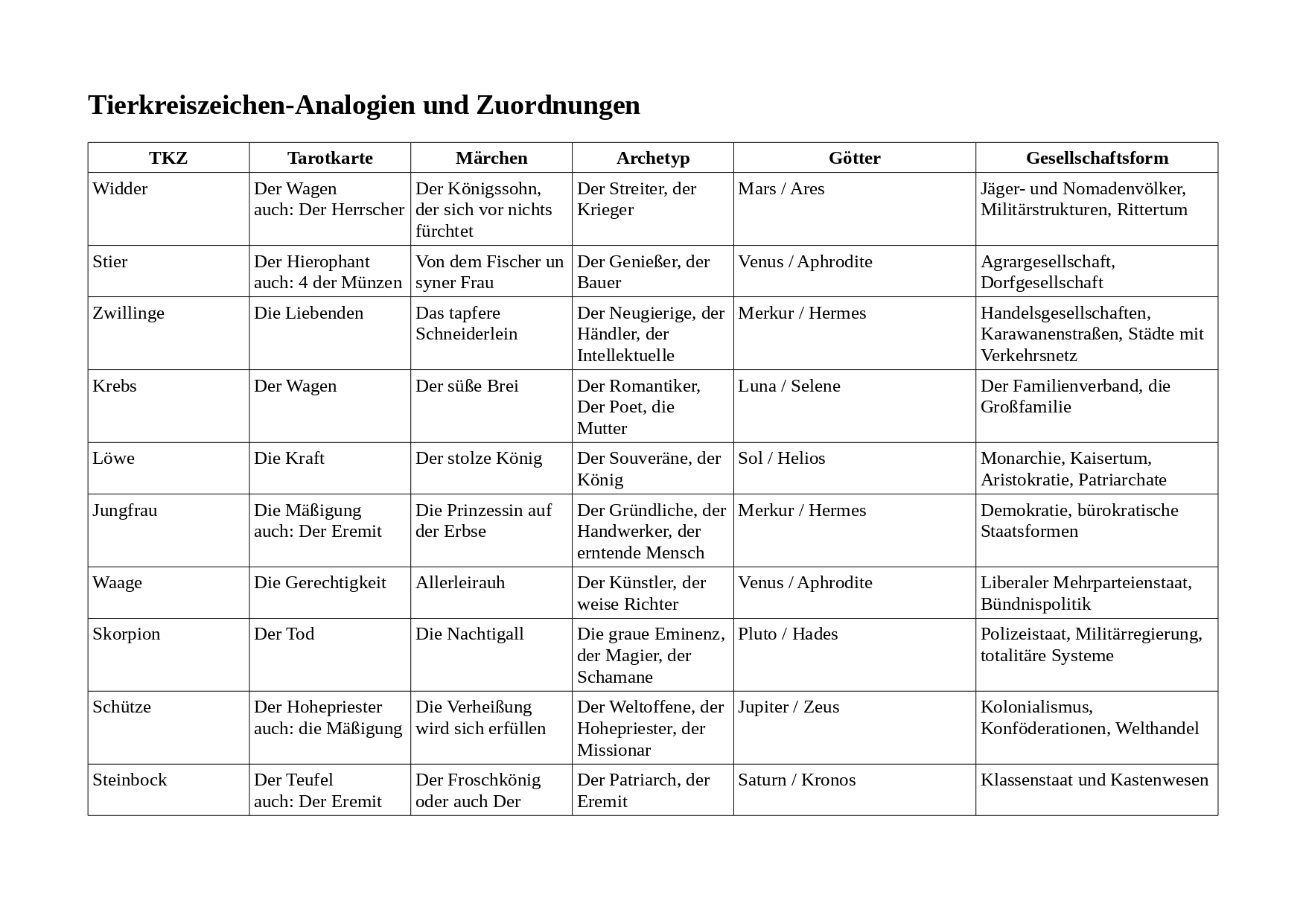 Zu guter Letzt: Entsprechen Tarotkarten auch dem Tierkreis ? Welches Märchen erzählt welch archetypische Geschichte ? Wie ordnen wir die Götter den Sternzeichen zu oder Formen des gesellschaftlichen Zusammenlebens ?