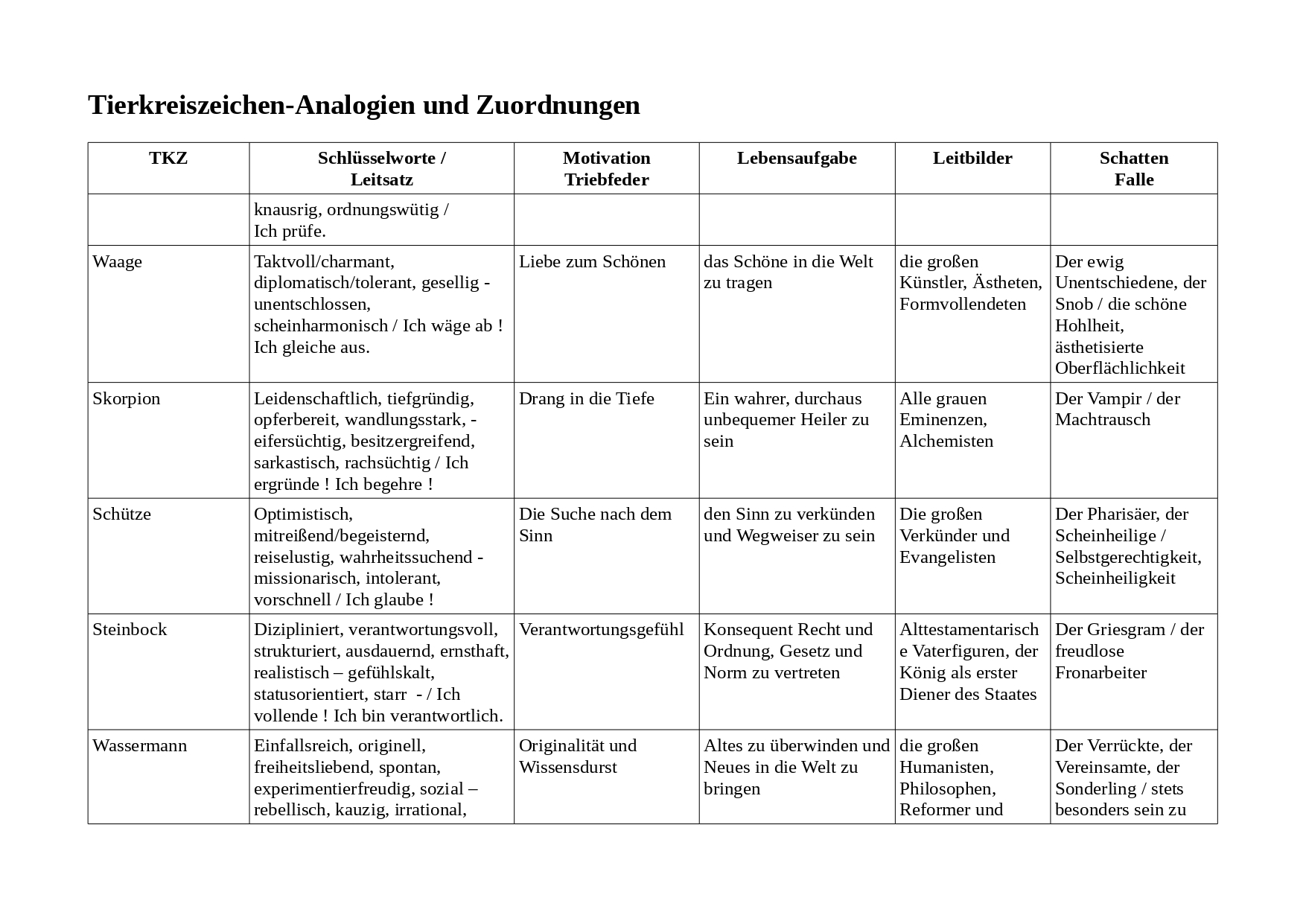 Was sind die Schlüsselworte für die Eigenschaften der Tierkreiszeichen ? Was motiviert sie im Leben ? Wie lässt sich eine Lebensaufgabe beschreiben ? Wer stellt ein Vorbild, ein Leitbild dar ? Welche Schattenseiten sind archetypisch ?