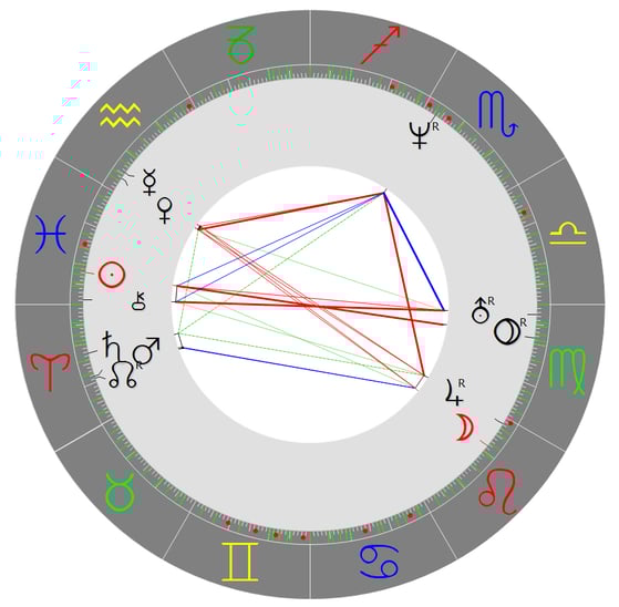 Die exakte Geburtszeit des Horoskopeigners ist unbekannt (somit sind keine Achsen/Häuser angezeigt).