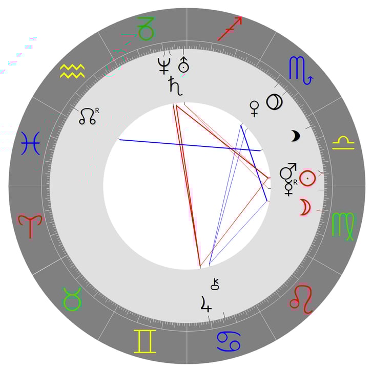 Dieses Geburtshoroskop zeigt einen Menschen, der sich immer wieder neu produziert und innovative Überschriften für seine jeweiligen Werke findet. Womöglich übt er immer wieder neue Gruppenzughörigkeit und findet sich doch häufig im Solokünstlerdasein wieder (Mondknoten im Wassermann).